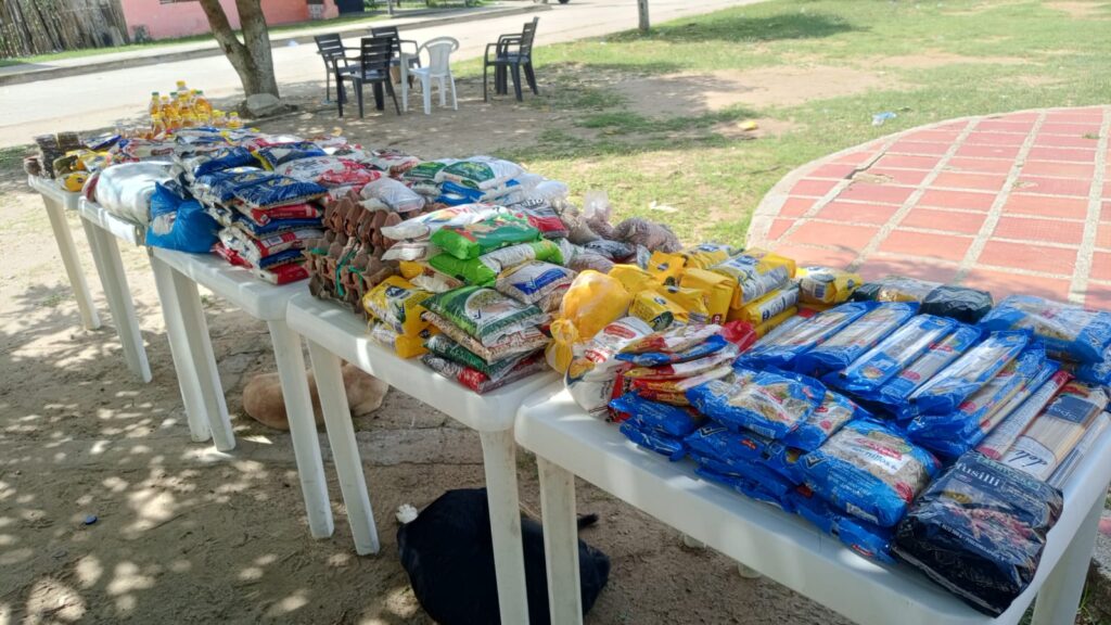 Fue el viernes anterior cuando la comunidad decidió juntar lo que tenía. No había discursos ni megáfonos: solo manos ofreciendo. Una libra de arroz, dos latas de atún, un paquete de velas, un aceite, cuatro panelas. Esas pequeñas donaciones, casa por casa, llenaron bolsas que luego serían mercados para quienes, en San Cristóbal, cargan la vida más apretada que otros.