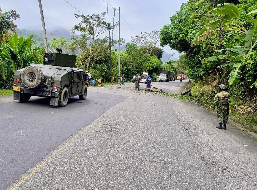 Las tropas, en un trabajo articulado con @InviasOficial contribuyen a mantener el flujo vehicular en el sector y realizan las inspecciones necesarias en el lugar, descartando alguna otra posible acción terrorista contra los transportadores y campesinos de la región.