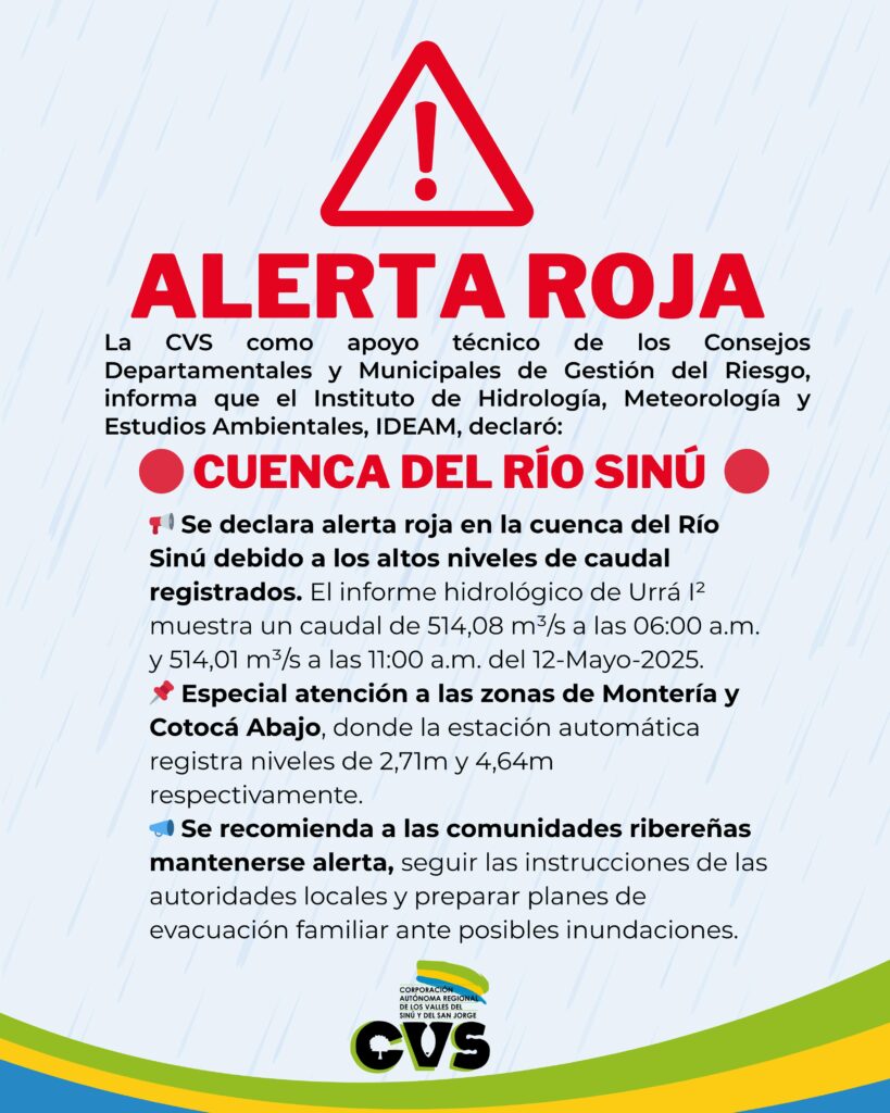 Se declara alerta roja en la cuenca del Río Sinú debido a los altos niveles de caudal registrados. El informe hidrológico de Urrá I² muestra un caudal de 514,08 m³/s a las 06:00 a.m. y 514,01 m³/s a las 11:00 a.m. del 12-Mayo-2025.