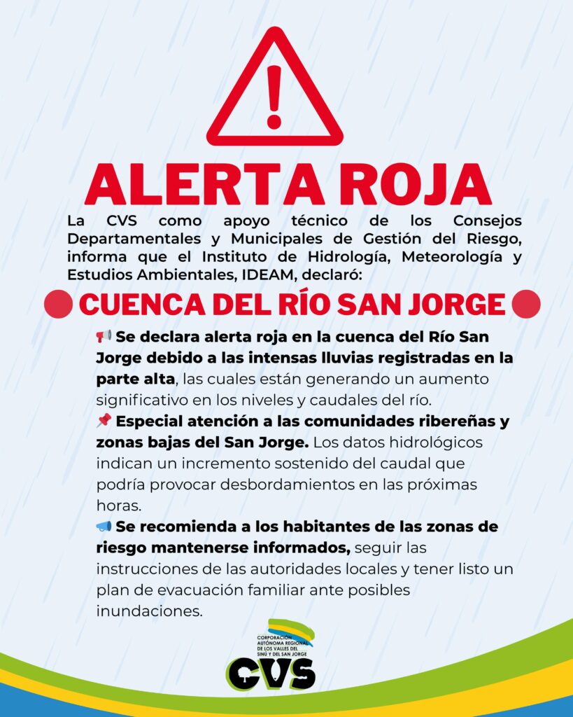 Se declaró alerta roja en la cuenca del Alto San Jorge, debido a las lluvias registradas en la parte alta, las cuales podrían generar crecientes en el rio San Jorge y sus aportantes.