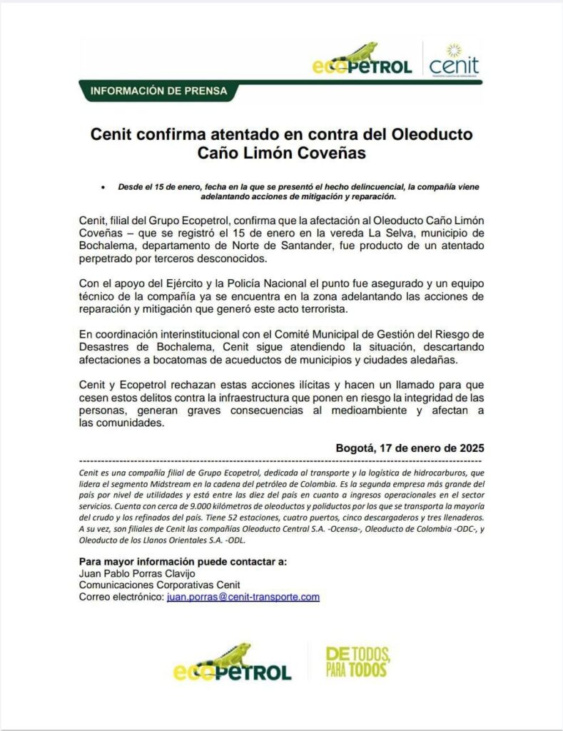 Redacción: Cenit, filial de Ecopetrol, confirmó que la afectación al Oleoducto Caño Limón Coveñas fue consecuencia de un atentado “perpetrado por terceros desconocidos” el 15 de enero, en Norte de Santander.