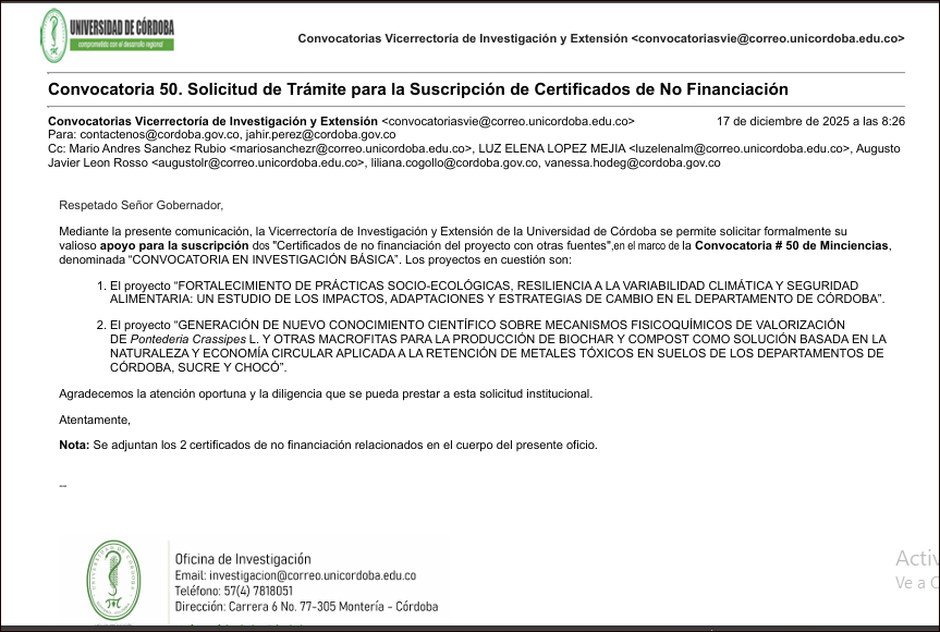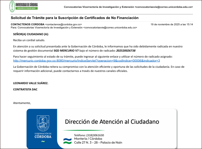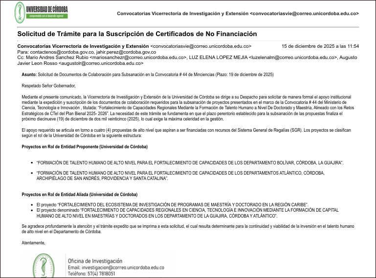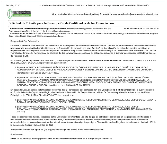 - El historial de comunicaciones remitidas al despacho del gobernador de Córdoba; por parte de la Vicerrectoría de Investigación y Extensión solicitando la firma de las mismas. La primera comunicación enviada el 18 de noviembre de 2025; recibió constancia de radicado el 19 del mismo mes, a las 3:14 de la tarde; por parte de la dependencia competente del Departamento.