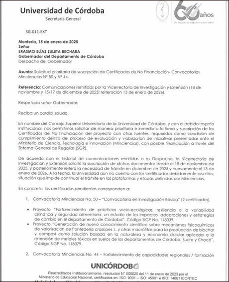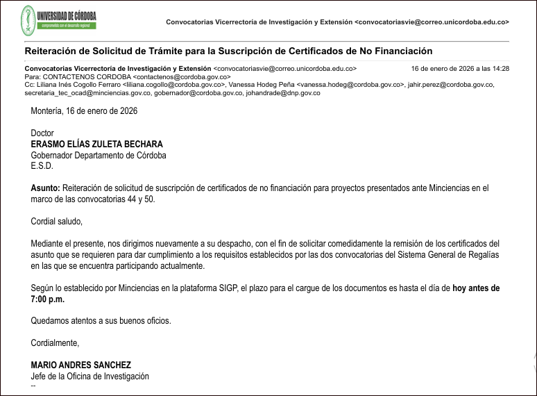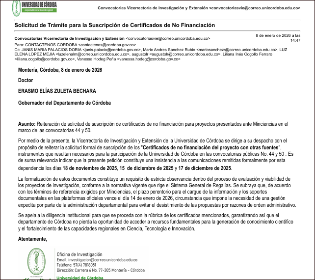 - Las convocatorias de Minciencias, están sujetas a unas formalidades normativas que exigen el cumplimiento de requisitos para acceder; entre ellos, una carta de aval por parte de la Gobernación del departamento. Por ello, desde la Vicerrectoría de Investigación y Extensión, instancia institucional responsable del proceso; solicitamos, a través de los conductos institucionales, la firma de la carta de aval; enviada en varias ocasiones y con fechas diferentes a los correos electrónicos del señor gobernador, varios asesores de despacho, al director de Ciencia y Tecnología de la Gobernación y a la delegada del gobernador en el Consejo Superior de la Universidad de Córdoba; en las mencionadas comunicaciones se solicitó el aval para participar en las convocatorias de ciencia, tecnología e innovación; sin respuestas por parte del ente territorial.