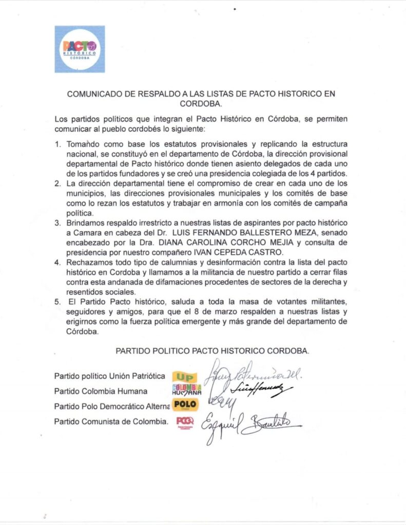 • Los partidos políticos que integran el Pacto Histórico en Córdoba, se permiten comunicar al pueblo cordobés lo siguiente:
