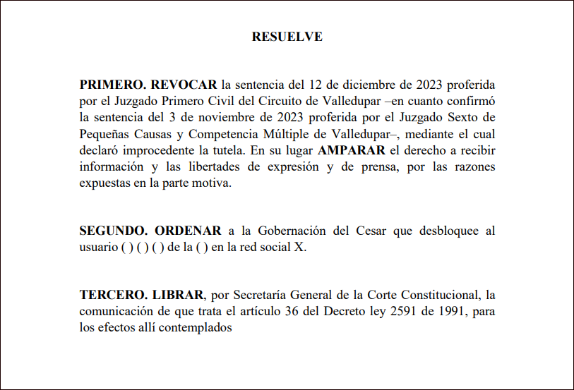 Como resultado de lo anterior, la Corte ordenó a la Gobernación desbloquear al periodista y prohibió futuros bloqueos a otros usuarios, a menos que haya razones justificadas basadas en normas neutrales previamente establecidas.