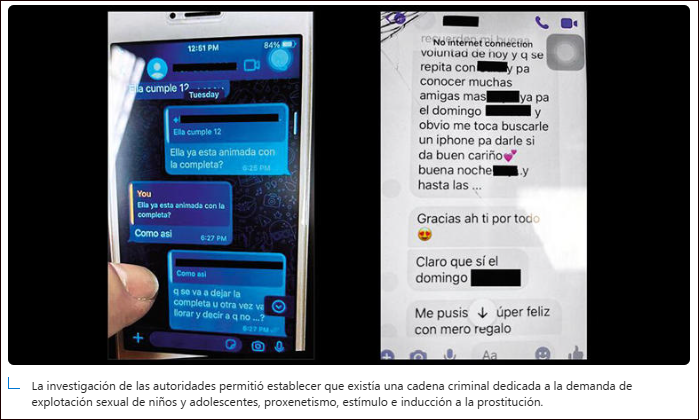 Dentro de las conversaciones extraídas, se descubrió que este abusador contactaba a dos mujeres, conocidas como Lily y María Camila, a quienes les encargaba la tarea de conseguir niñas menores de edad para organizar encuentros sexuales a cambio de dinero (entre 200.000 y 400.000 pesos) y dispositivos electrónicos (celulares de alta gama).