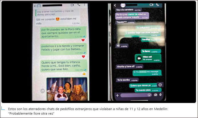 Los encuentros, de acuerdo con una investigación policial, se realizaron en un apartamento de Medellín, donde el pedófilo abusó de dos menores de entre 11 y 12 años. Tanto el depredador sexual como las proxenetas fueron capturados en los últimos días y los acusaron por los delitos de explotación sexual de niños, niñas y adolescentes, estímulo a la prostitución de menores y pornografía infantil.