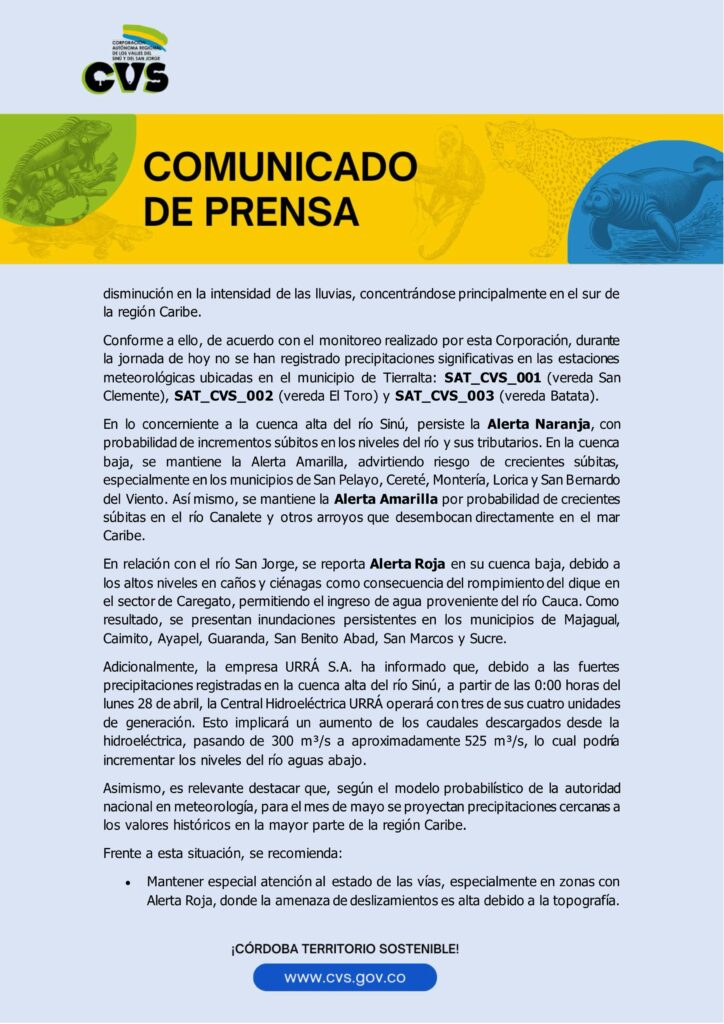 Adicionalmente, la empresa URRÁ S.A. ha informado que, debido a las fuertes precipitaciones registradas en la cuenca alta del río Sinú, a partir de las 0:00 horas del lunes 28 de abril, la Central Hidroeléctrica URRÁ operará con tres de sus cuatro unidades de generación. Esto implicará un aumento de los caudales descargados desde la hidroeléctrica, pasando de 300 m³/s a aproximadamente 525 m³/s, lo cual podría incrementar los niveles del río aguas abajo.