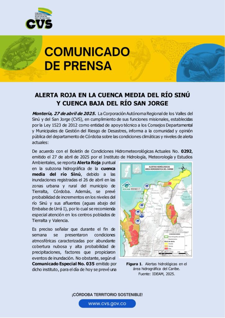 De acuerdo con el Boletín de Condiciones Hidrometeorológicas Actuales No. 0292, emitido el 27 de abril de 2025 por el Instituto de Hidrología, Meteorología y Estudios Ambientales, se reporta Alerta Roja puntual en la subzona hidrográfica de la cuenca media del río Sinú, debido a las inundaciones registradas el 26 de abril en las zonas urbana y rural del municipio de Tierralta, Córdoba. Además, se prevé probabilidad de incrementos en los niveles del río Sinú y sus afluentes (aguas abajo del Embalse de Urrá I), por lo cual se recomienda especial atención en los centros poblados de Tierralta y Valencia.