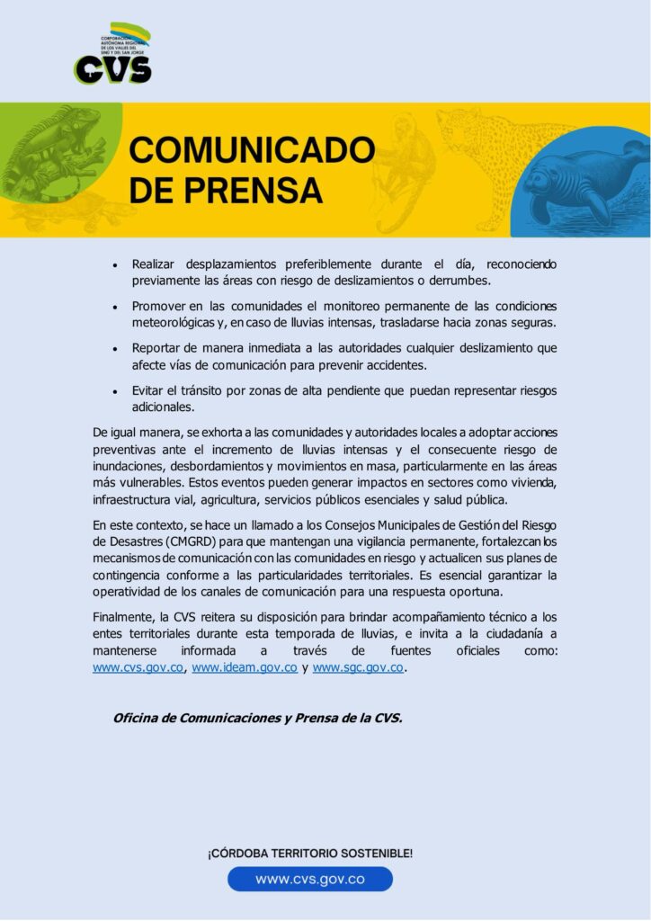 Finalmente, la CVS reitera su disposición para brindar acompañamiento técnico a los entes territoriales durante esta temporada de lluvias, e invita a la ciudadanía a mantenerse informada a través de fuentes oficiales como: www.cvs.gov.co, www.ideam.gov.co y www.sgc.gov.co.