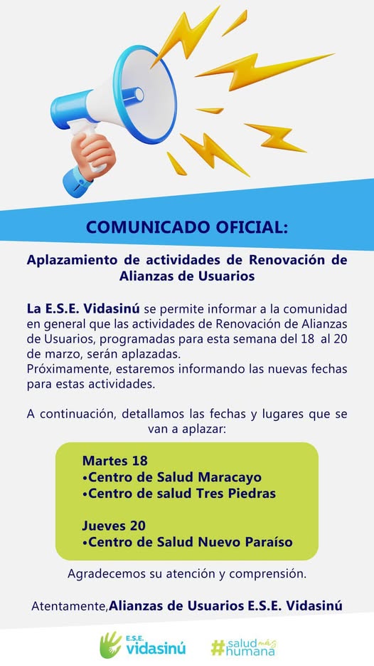 La E.S.E. Vidasinú se permite informar a la comunidad en general que las actividades de Renovación de Alianzas de Usuarios, programadas para esta semana del 18 al 20 de marzo, fueron aplazadas.