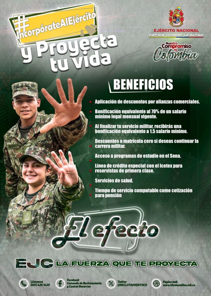 Igualmente, estos jóvenes podrán acceder a una bonificación mensual de 996.500 pesos, equivalente al 70% de un salario mínimo legal mensual vigente, bancarización, oportunidad para continuar la carrera militar, entre otros beneficios que los incorporados e incorporadas tendrán al integrar las filas de la institución.